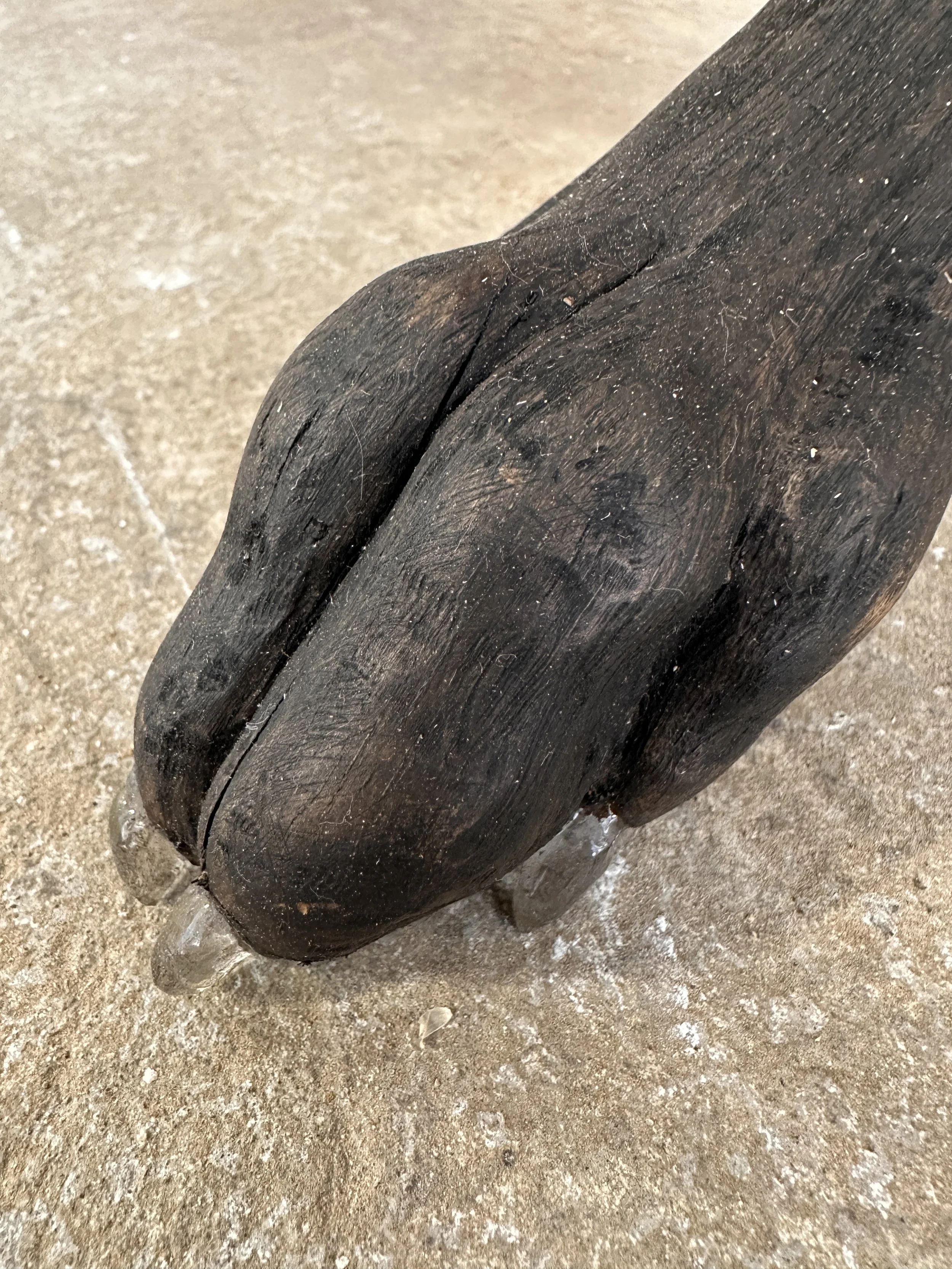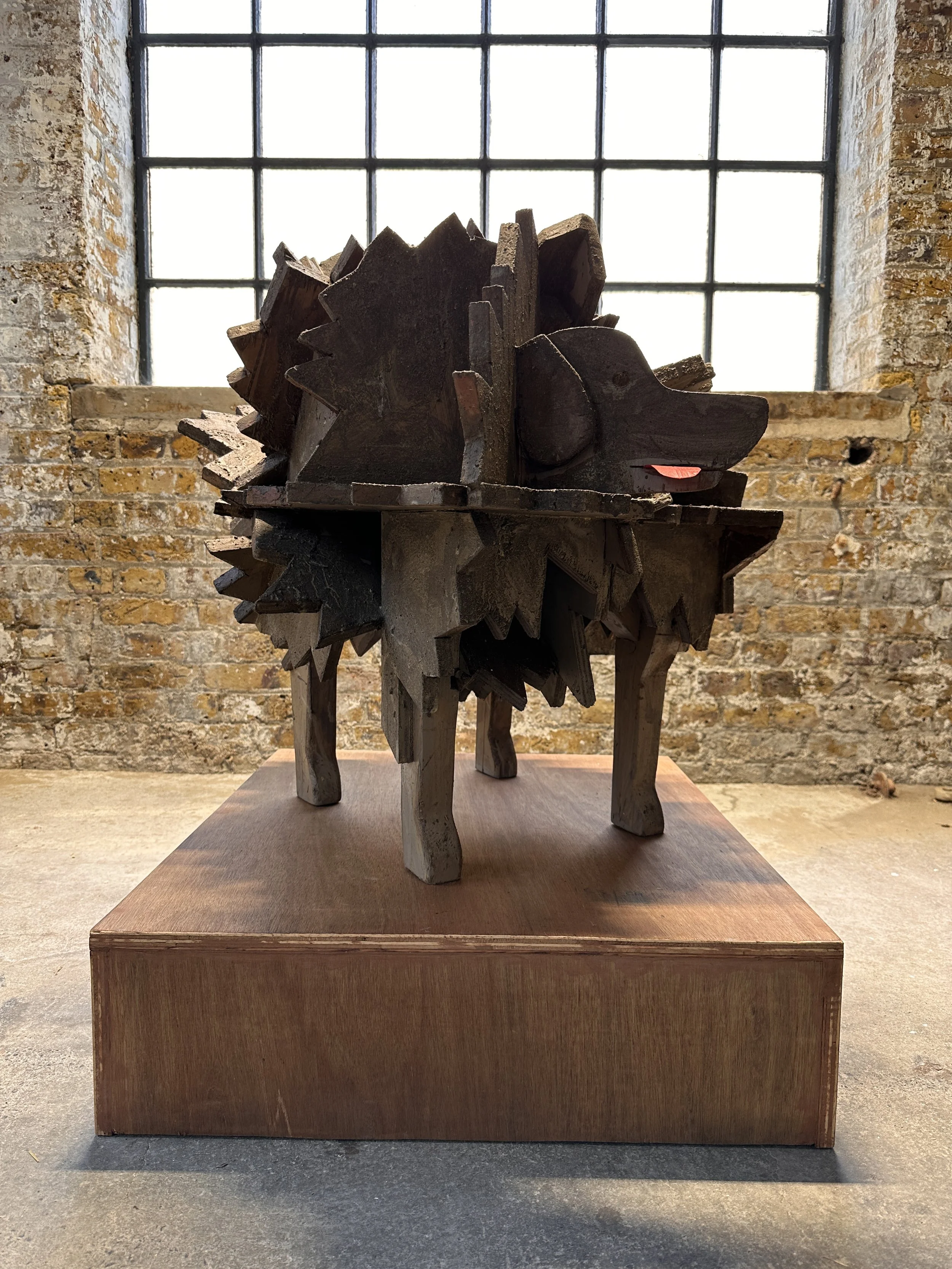 Becky Tucker and Lee Grandjean bring this mediation into sculptural form. Tucker’s Pinna, referencing the anatomical structure of a dog’s ear, feels both bodily and alien — an imagined future relic that blurs the boundary between organism and object. Grandjean’s earthy, tactile sculpture Mud Dog Ruff embodies presence through material — a confrontation between form and instinct, surface and shadow. Together, their works speak to the physicality of the animal body, and its strange closeness to our own.
